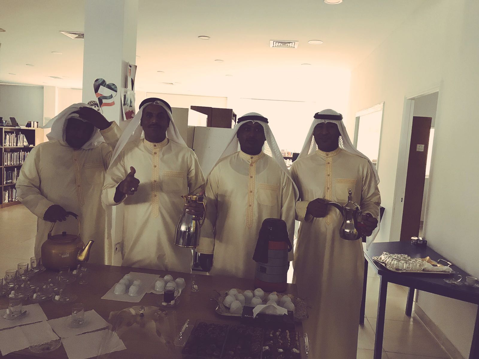 I wanted to add personal touches which would both ease the audience, and offer a unique approach to the presentation. So I served arabic coffee, tea and dates to give them a little taste of Kuwaiti flavors. I also played background Kuwaiti music, and hung items of Kuwaiti clothing around the space in which I was presenting.